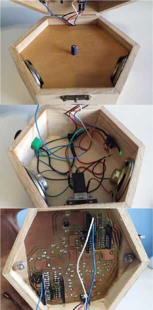 Otra cosa que hicimos, que no es necesario, es la placa de madera con el condensador. También utilizamos la DREMEL nombrado antes para hacer la forma de la caja. Mente los cables, los altavoces y la bisagra! El condensador ayuda a dejar de fumar y poner otra vez la placa de madera, que cubre todos los cables dentro de la caja mejora su aspecto. Usted será capaz de mantener las cosas dentro de la caja!