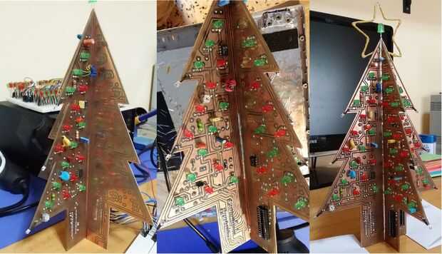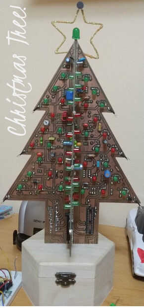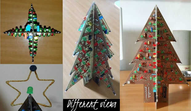 La primera imagen muestra cómo soldó con autógena la ranura. La última parte de él muestra la estrella de la que hicimos con un trozo pequeño de alambre suave. Debe ser un conductor porque vamos a poner el micrófono allí. En el sorteo del circuito nos dejó dos agujeros en la parte superior de una de las hojas. Hicimos a propósito para la soldadura ahora la estrella metálica. También les dejamos dos agujeros para el LED enorme soldado con autógena en la parte superior, también necesita el cable de thermoretractable. La segunda imagen muestra cómo se ve como con el micrófono y el LED soldado con autógena al árbol.