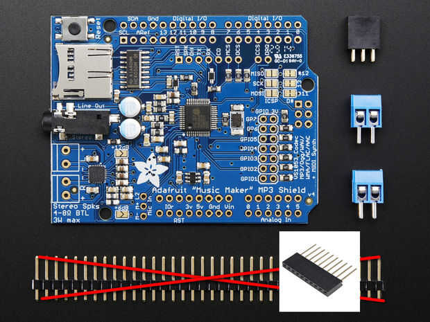 He comprado el escudo de Adafruit MP3 sin montado así que reemplacé los pernos encabezado con prototipo y fácilmente capaz de pila encabezados por lo que yo podía apilar otros artículos como no voy a dejar este escudo MP3 aquí permanentemente.