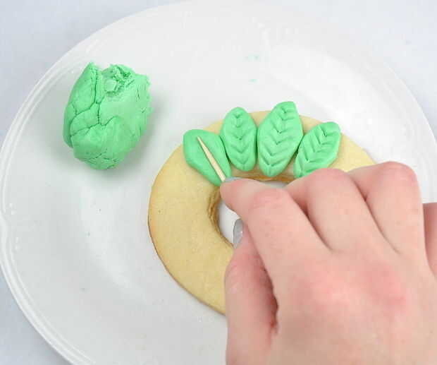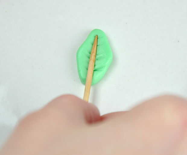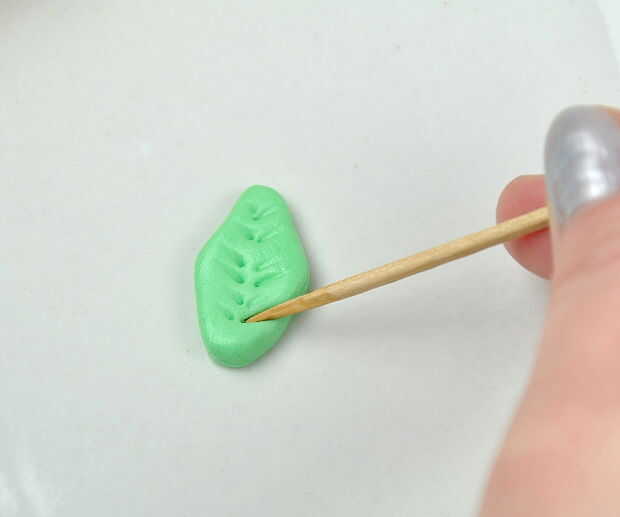 - Usando el palillo de dientes, hacer el pliegue de centro de la hoja, luego agregue las venas laterales.
