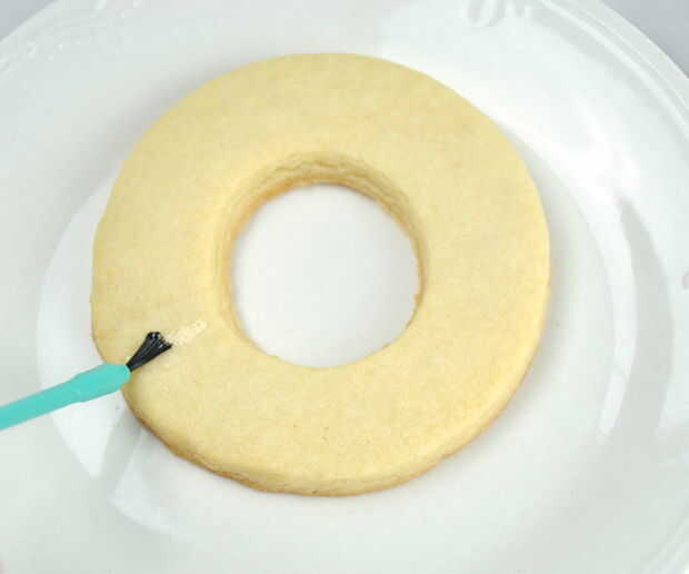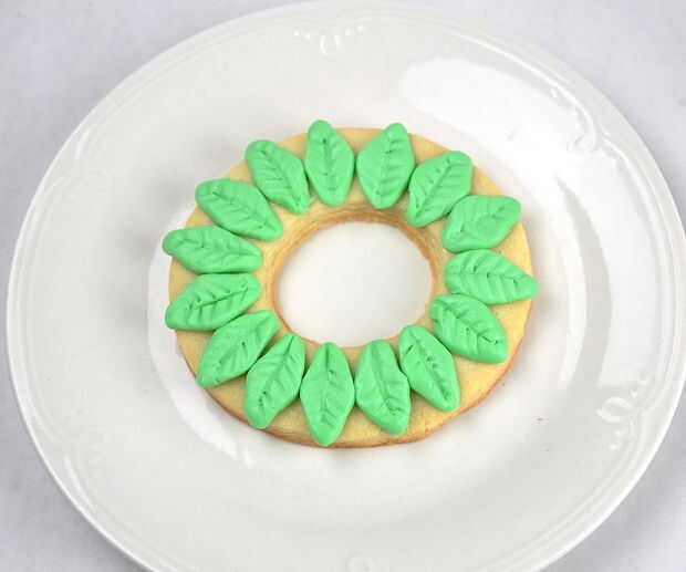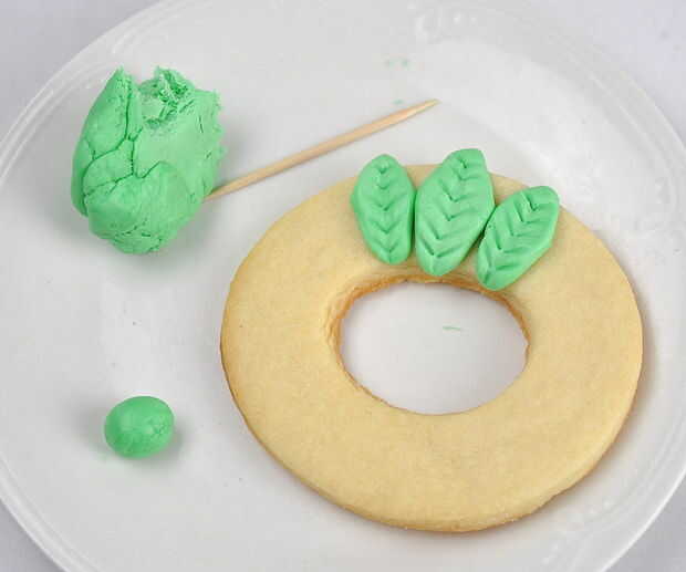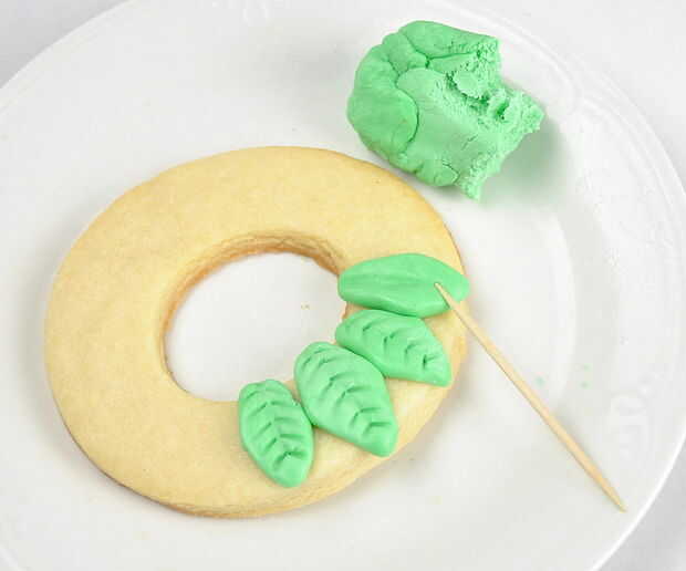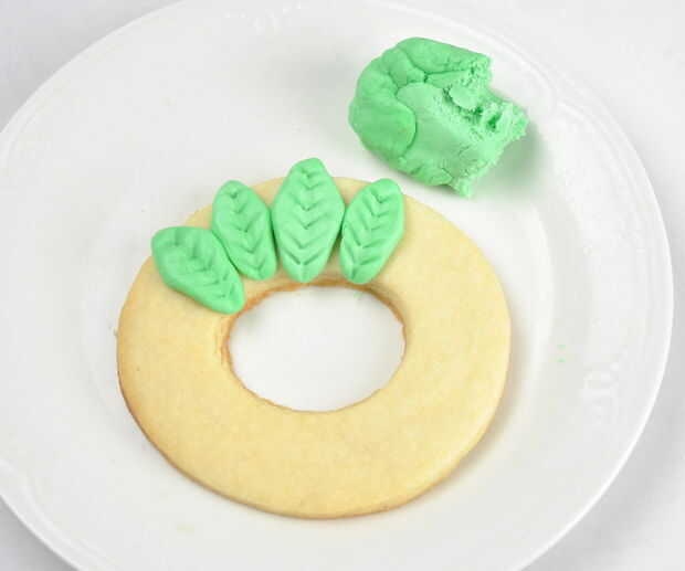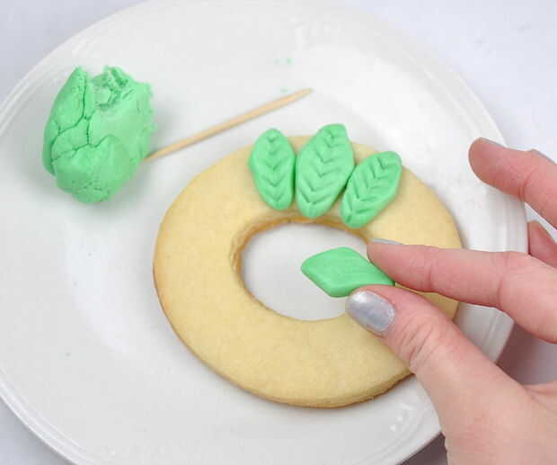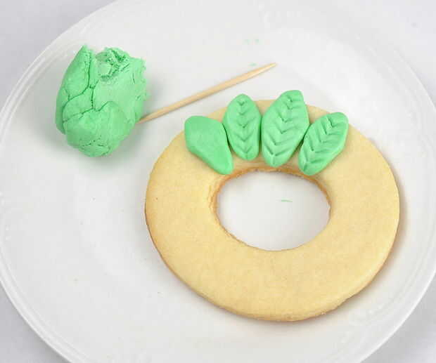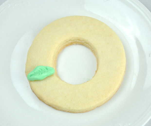 - Usando el jarabe de maíz, pega la hoja en la cookie