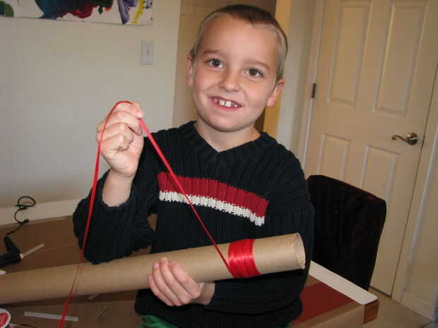 encontré que cortar la cinta 6" tiras enlaces de buen tamaño para mi guirnalda. En lugar de medir una longitud de seis pulgadas de la cinta y cortar una y otra vez, usted puede hacer muchas cintas la longitud adecuada con un corte. Para hacer este abrigo su cinta alrededor de la envoltura de papel tubo superposición de algunos, pero asegúrese de no torcer la cinta ya que esto dificulta su corte.