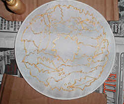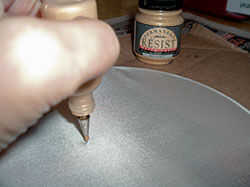 3) a partir del centro, dibujar de la corona utilizando la resistencia de Gold Permanent Water-Based. (Es recomendable previamente esbozar su diseño con un lápiz o pluma de Auto Fade). Cuando dibujo, sostenga la plomada de botella del aplicador, con la punta apoyada suavemente sobre la seda y apriete un poco como dibujar suavemente la punta a través de la seda (véase el cuadro para la correcta posición). Todas las líneas de resistencia deben ser ininterrumpidas. Debe también hacen formas completadas. Colorantes necesitan resistir líneas para seguir siendo independiente. La brecha más pequeña permite la purga de tinte en otras áreas.