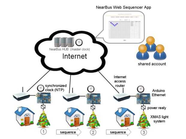 Esta nota describe cómo implementar un gran secuenciador de luz de Navidad (para un pequeño barrio o a través de diferentes países) utilizando una implementación de Arduino de sistema NearBus. Esta aplicación le permitirá administrar hasta 16 luces desde la web con una precisión de 100 ms que ofrecen suficiente capacidad para aplicar luz potente efectos a gran escala.