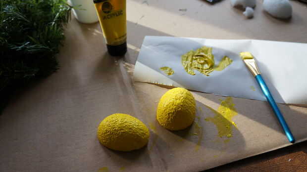 La pintura utilizada aquí fue acrílico, de color amarillo limón. Una cantidad justa de pintura necesitará ser utilizado como la superficie de los huevos es porosa y tendrá que ser rellenado.