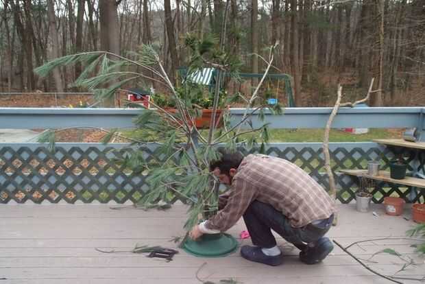 Usted puede definitivamente obtener un árbol de Navidad real y configurarlo, pero tuvimos una gran tormenta de hielo y un montón de ramas cayó en nuestro patio. Figura, por qué los residuos. Mi esposo había atascado en un soporte de árbol de Navidad, los atados y atornilla la base a la cubierta.
