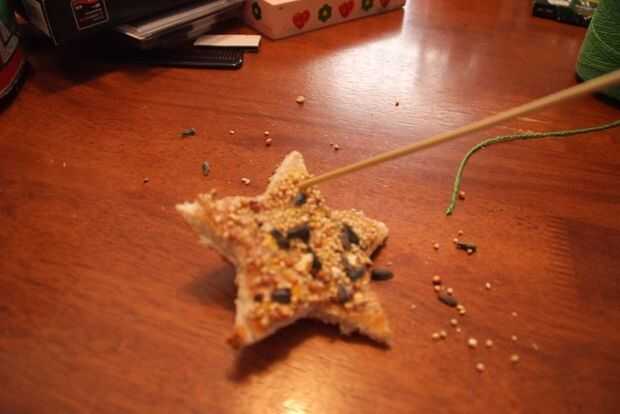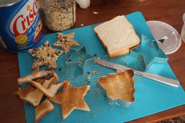 Hacer un brindis, corte en formas con cortadores de galleta, difunda en algunos cricso y se cubre con semilla del pájaro. No dude en utilizar manteca de cerdo o sebo, pero somos vegetarianos, y no podía pensar en nada más burdos que derretirse algunos sebo y extenderla sobre una tostada.