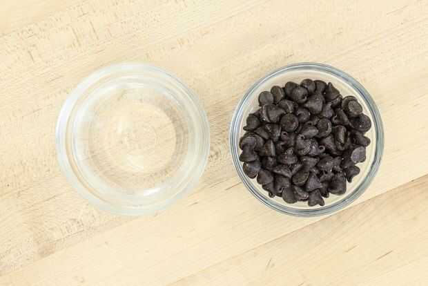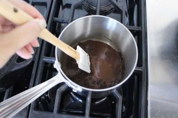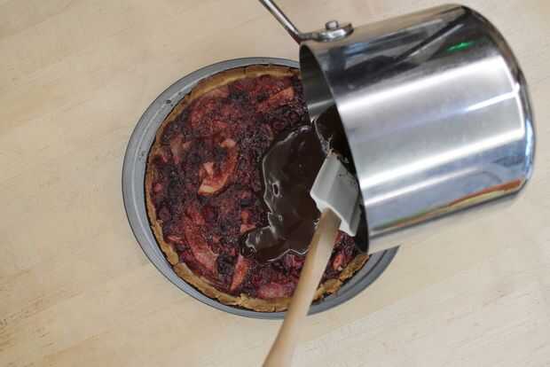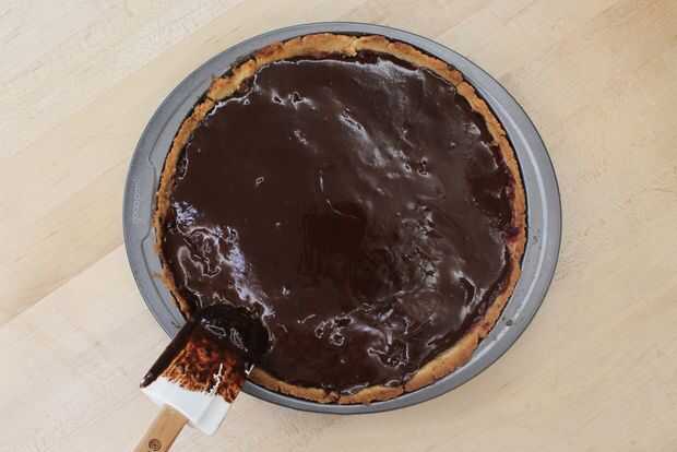 6 onzas de chocolate y 1/3 de taza de agua en una cacerola se combinan. Fundir el chocolate a fuego suave, revolviendo constantemente hasta que esté suave. Verter por encima de la tarta y enfriar por 10 minutos. Después, ponen en la nevera para endurecer.