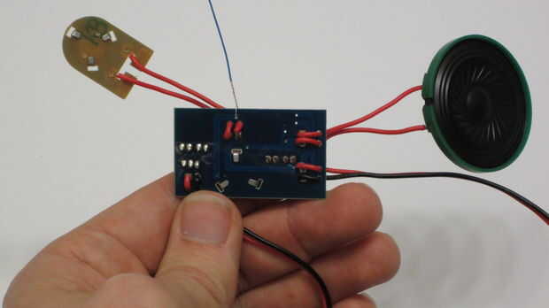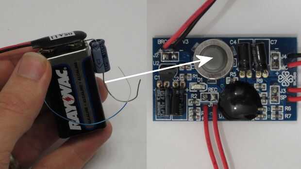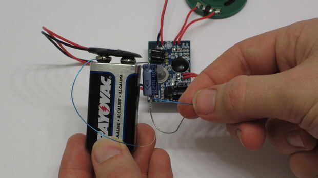 Luego, coloque este sensor de movimiento para el pasador de juego en el módulo de la grabación. El juego se activa cuando el pin de juego en el módulo está conectado a tierra. Normalmente esto se logra presionando el botón play. En este caso, estamos utilizando nuestro sensor de movimiento para hacer la conexión. El cable del sensor de movimiento ya está conectado al borne negativo de la batería. Así que ahora todos tenemos que hacer es conectar el otro extremo del sensor de movimiento (el plomo negativo del condensador) al juego pines en el módulo. Tome el segundo cable del imán y quitar cualquier aislante de los extremos. Inserte un extremo del cable en cualquiera de los dos agujeros indicados en el cuadro. No necesita la conexión de la soldadura. Sólo el cable a través del orificio del perno del lazo y tuerza el alambre contra sí mismo hasta que esté firme. Esto debe hacer una conexión suficiente. Luego enrosque el otro extremo del cable en el terminal negativo del condensador. Agite el sensor para asegurarse de que activa la función de reproducción correctamente. Si no es así, probablemente necesite ajustar la posición de los cables.