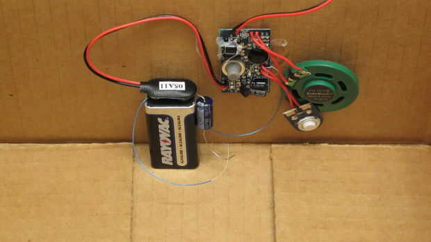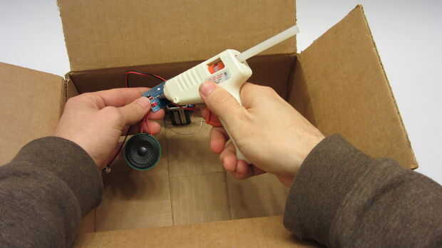 Una vez que las cosas están funcionando, fijar el conjunto al lado de la caja con pegamento caliente. Sacuda la caja un par de veces y ajustar los cables que hacen contacto cuando ligeramente agitado.