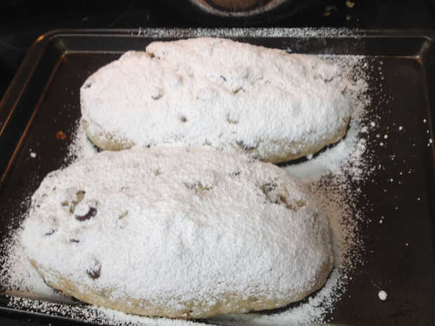 Deje que se enfríe stollen a temperatura ambiente en la bandeja de enfriamiento, luego cepillo de nuevo con más derretido mantequilla y cubierta generosamente con azúcar glas