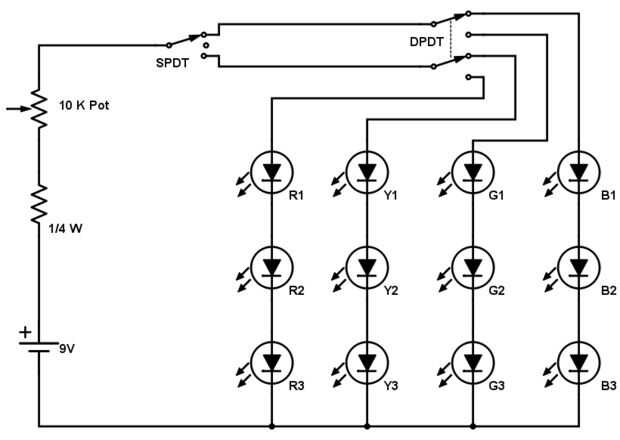 Tiro doble unipolar (SPDT) interruptor de cambios entre colores fríos y colores cálidos. Es importante que uno que tiene 3 posiciones diferentes - así que son capaces de apagar la luz ;) Interruptores DPDT entre colores en ambos grupos.