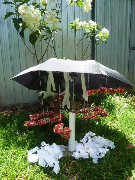 - PVC de la pipa: elegir lo suficientemente amplia para el mango del paraguas y del mismo diámetro que las bolas de plástico de la pipa del PVC. La bola tiene el tubo en su lugar pero todavía permite el movimiento. Más la longitud del tubo el más el mango del paraguas se admite así que el más estable el "árbol". Empezar a larga y corta - trate de 30cm.