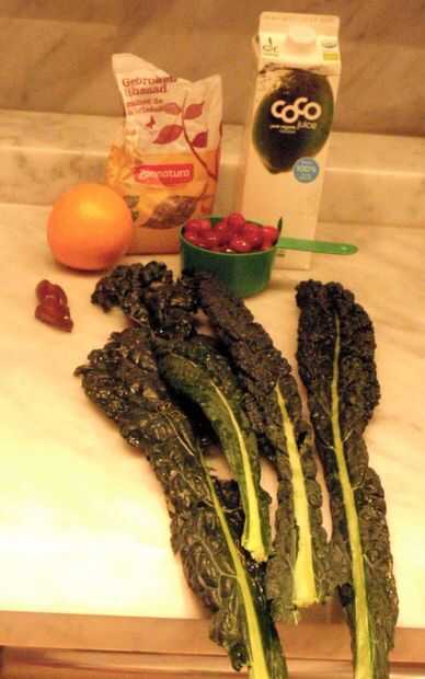 4 col rizada negra hojas, limpiadas, quitar los tallos grandes (yo usé 3 grandes y 1 pequeña hoja)