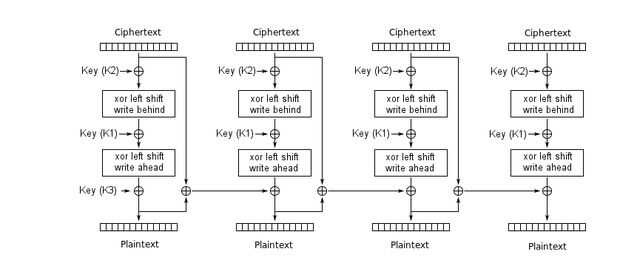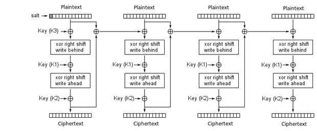 En estos dos diagramas se puede ver el esquema general de cifrado o descifrado del mensaje. He incorporado un modo de funcionamiento llamado "Multiplicación encadenamiento de bloque de cifrado". Este método requiere el descifrado de la primera línea antes de la siguiente línea y el modo.