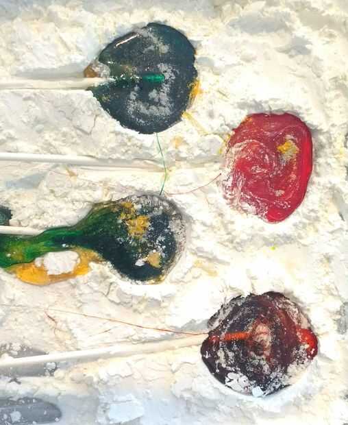 Nota: Como ves aquí en las fotos, he probado el enfoque de molde de almidón de maíz, también. Tamiza la fécula de maíz en una fuente para horno profunda y me utilizado mi 1/4 taza taza inferior para hacer muescas en la fécula de maíz para más de medición, piruletas más gruesos. Estos no tienen tanto detalle en ellos, como los ingredientes la profundidad impidió llegar a la parte inferior (que técnicamente sería el frente cuando termine), y girando los colores era un poco de un desafío como la maicena remolino en las piruletas. PERO, todavía resultan cool como se verá en el siguiente paso (por ejemplo la nebulosa cola verde).