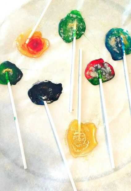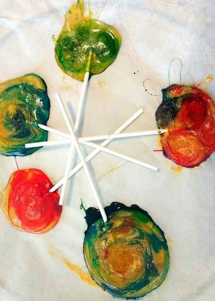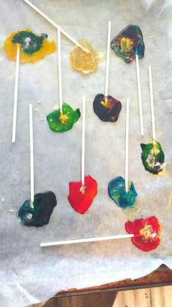 He encontrado que hacer Piruletas de mano libre sobre las hojas para hornear, es más fácil cuando permite que el caramelo se enfríe un poco primero en el vidrio medido sobre la consistencia de un jarabe base (o de lo contrario será demasiado delgada y que moquea y extenderá por todas partes).