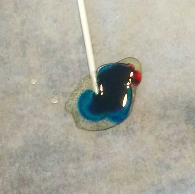 3. Añadir el colorante gotas ahora (antes de verter el siguiente caramelo. Hacer cada uno completamente uno a la vez.. .Si no, las paletas se endurecen demasiado rápido antes de que se puedan conseguir todos los colores y brillo en).