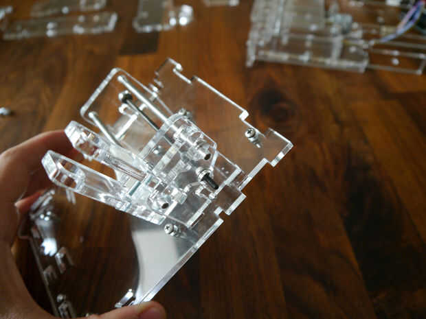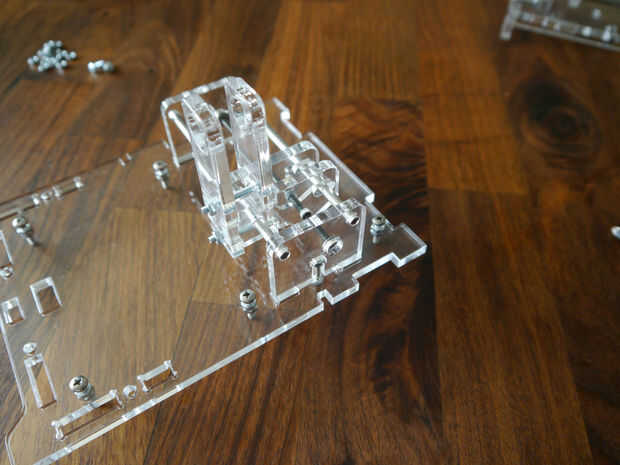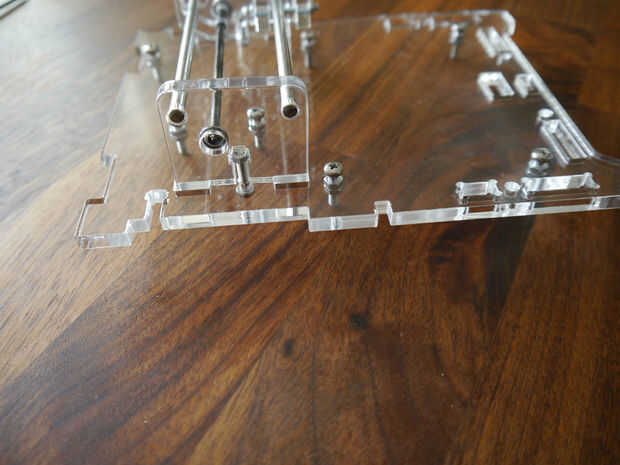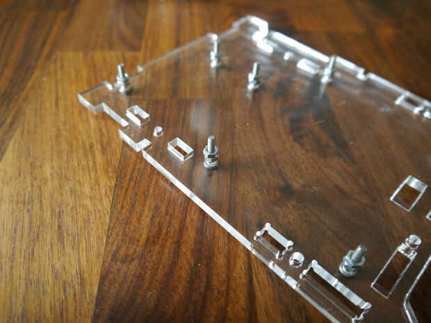 Bereitet die Rückenplatte wie auf dem Bild vor, es werden die Schrauben mit je 2 Muttern befestigt, die Muttern dienen als Distanzhalter für den Arduino und das Mainboard.