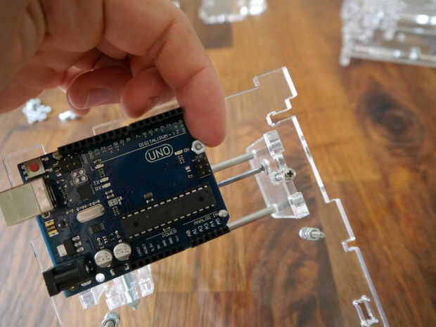 Jetzt wird der Arduino auf die Schrauben mueren wir im vorherigen Schritt vorbereitet haben gesteckt und mit 2 Muttern gesichert. Die zwei Schrauben langen da der Arduino auf der anderen Seite später vom Gehäuse fixiert wird.
