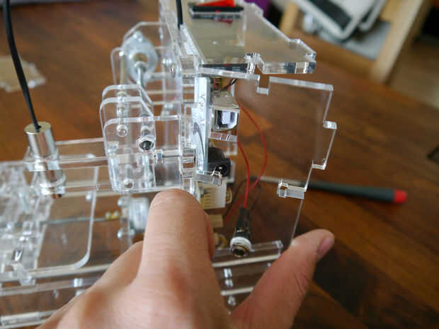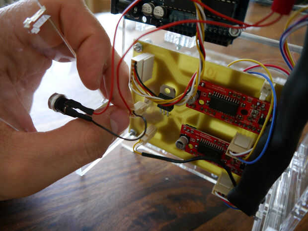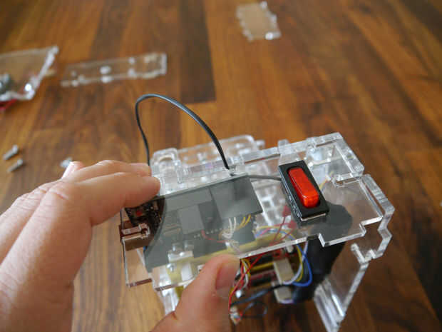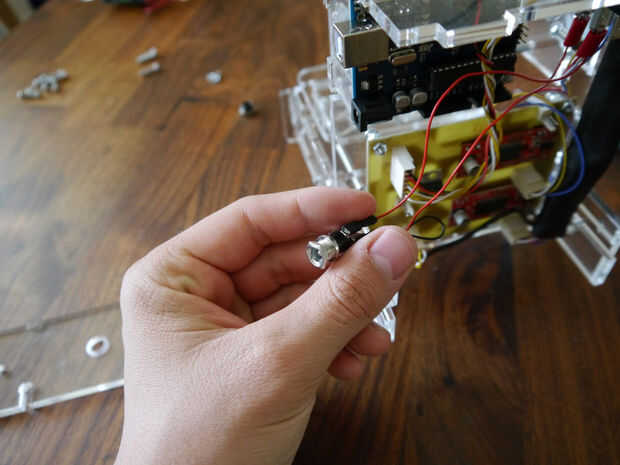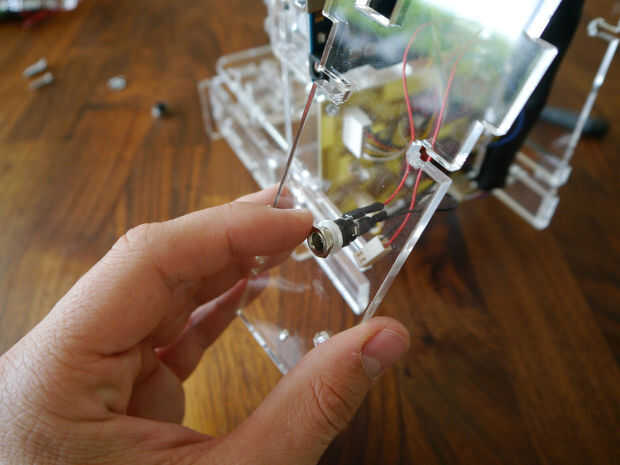 Die Buchse kommt en das Seitenteil mit dem Loch, schraubt die flache Mutter ab, steckt den Stecker durch und schraubt die Mutter wieder fest drauf. Verschraubt das Seitenteil mit dem Deckel und dem resto.