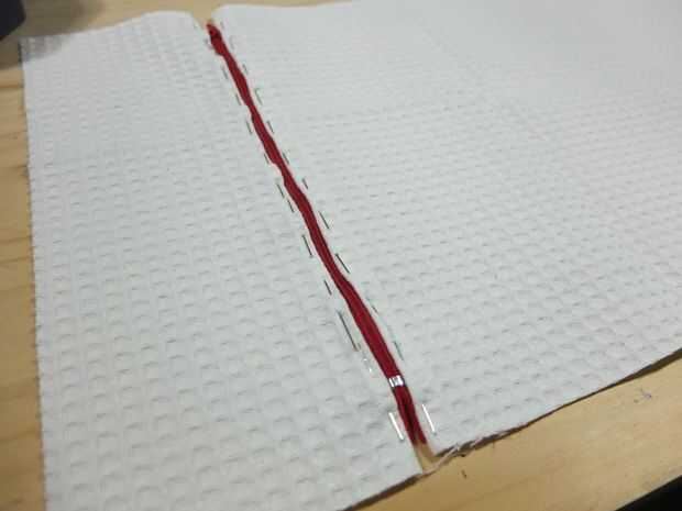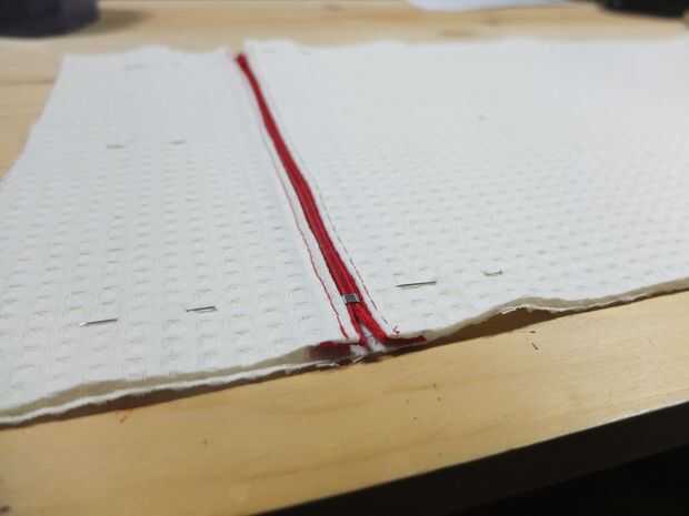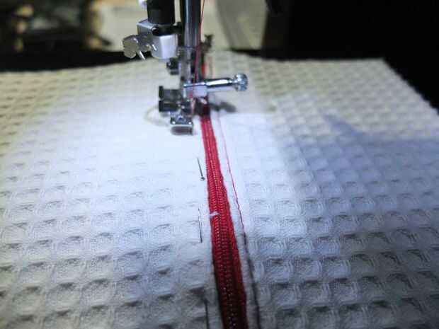 Para hacer un bolsillo pequeño, cortar una capa de tela interna en unos 10' de un lado. Inserte la cremallera allí, doblar los bordes y. Coser la cremallera. Tomar la segunda capa de tela interna y prender las dos capas juntas.