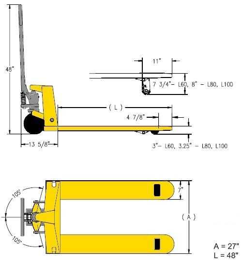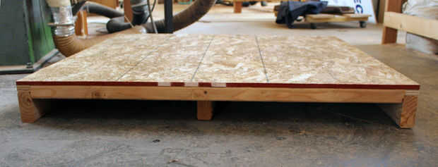 Si usted piensa que su cajón va a ser pesado o grande, definitivamente debe comenzar con una plataforma base para que pueda ser su tenedor o paleta secuestrada. Hay dos maneras de hacer esto. Construir la caja y fije una plataforma común (se muestra en la ilustración). O prefieren construir las canalizaciones verticales como parte de la base (usando un 4 x 4 extremo como la canalización vertical). Asegúrese de que el espacio es por lo menos 3.5" de la tierra! (Tenga en cuenta las dimensiones de una transpaleta para referencia).