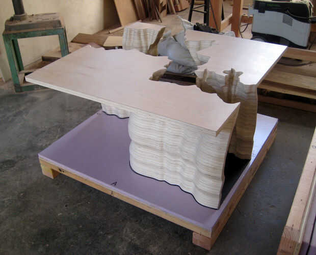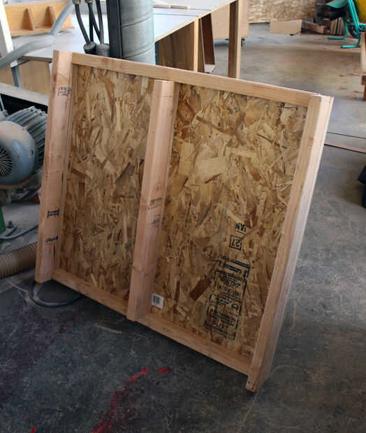 Las dimensiones de la base coinciden con las dimensiones de la escultura, agregar 1/2" perímetro para permitir espacio para la espuma por todos lados. La base tendrá que ser completamente enmarcado con 2 x 4 para asegurarse de puede soportar el peso de todo el camino alrededor. Corte sus elevadores de plataforma 4 x 4 (2) a la longitud con una tronzadora. Use los tornillos más largos * para sujetar las plataforma las canalizaciones verticales de la parte superior a la base de OSB después es cortado a la medida. Había Ripeado unos 2 x 4 por la mitad (de 3.5" de ancho a ancho de 1.75") al marco de los dos bordes de OSB). Asimismo estos fueron atados desde arriba con los tornillos más cortos.