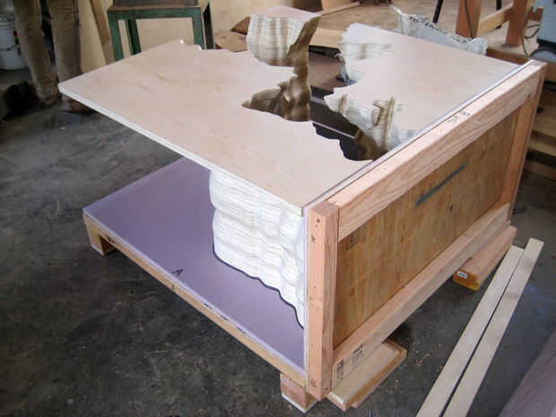 Recuerde también que habrá otra pieza de 1/2" de espuma en la parte superior, por lo que la altura de lado para tener en cuenta esa capa extra 1/2". A tornillo de los lados en la base para el montaje - añadir unos 2" total a calcular la altura final de las partes (extra en la parte superior, 1.5" extra en la base 1/2"). El forro de la espuma se corta más pequeño que las dimensiones de la madera. Debe ser la exacta misma altura que el objeto crated, conexión 1/2" hacia abajo desde la parte superior y 1/2" en de ambos bordes. Fije con los tornillos cortos para mantener en su lugar al igual que la base.