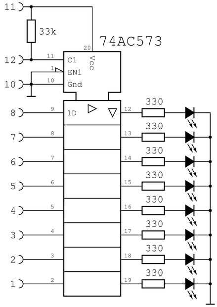 El circuito es bastante simple: las entradas de 8 bits de los 573 están conectadas a las señales de datos a ser monitoreados, el pasador de cierre permiten lleva a cabo en alto nivel por un resistor de pull-up de 33kΩ, pero se puede sobrescribir externamente por una lógica baja al cierre de la situación actual. Ya que quiero tener una indicación LED (recordemos que es la idea del proyecto) conecté la entrada de habilitación de salida directamente a GND.