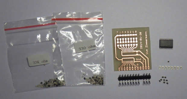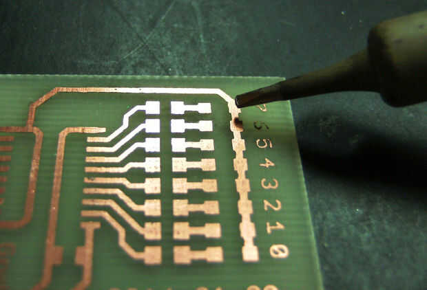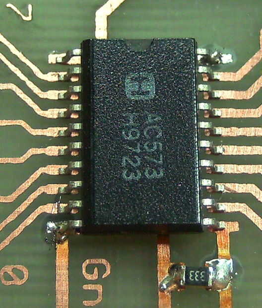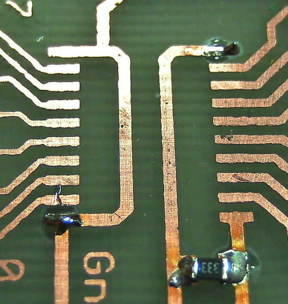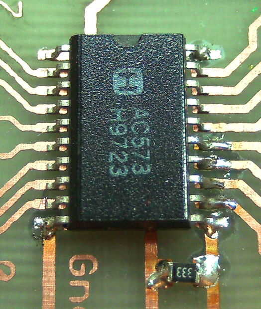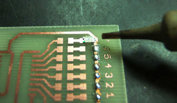 Para el paquete TSSOP20 del chip en la placa de la soldadura debe comenzar por colocar alguna lata en esquinas opuestas de la huella. Luego presiona el chip en la placa mientras que calentando estos dos pines secuencialmente. Entonces puede ir de uno de los otros pasadores a la siguiente y cada pin a su cojín de la soldadura. Para esto presiona el pasador en la almohadilla con la punta de su soldador y una vez caliente pin y pad bastante añades una pequeña cantidad de soldadura.