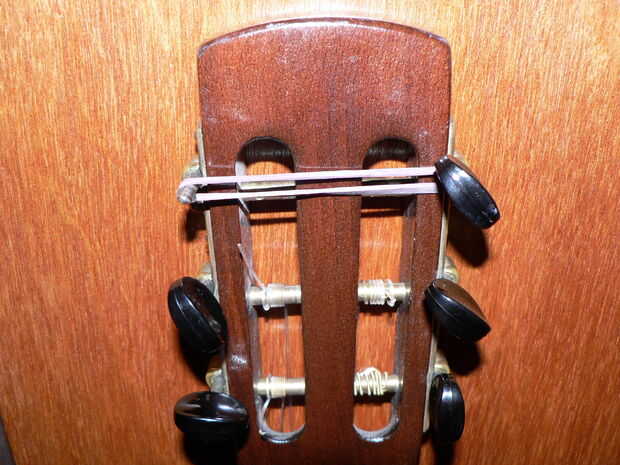Normalmente, cadena las cadenas top 3 en los sintonizadores del derecho y la parte inferior tres sintonizadores izquierdos, pero la guitarra tenía una devanadera rota así que encadenan lo un poco flojo.