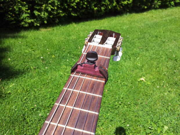 Su nueva cejilla está listo para usar. Sólo necesita establecer la base sobre el traste que desea utilizar en, envuelva la cinta alrededor del cuello, inserte la llave y gírela para apretar. La acción de girar la llave tire la cejilla hasta el diapasón, y el cuero protegerá sus cuerdas y el cuello.