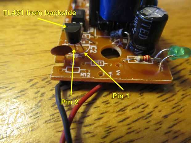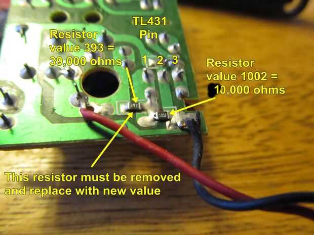 Ahora mira en la parte inferior de la PCB y verás 2 resistencias muy pequeñas en la parte del TL431. Se ven como 1/4 un grano de arroz y tienen números en ellos. Mina tiene un 1002 y un 393, que es un ohm 10.000 y 39.000 ohmios (100 + 2 ceros = 10.000) y (39 + 3 ceros = 39.000)