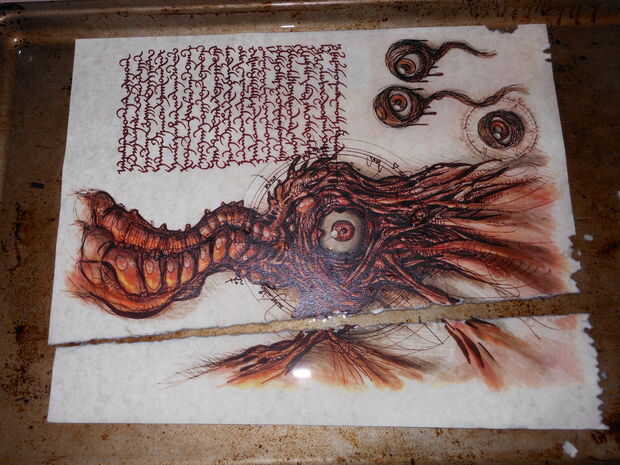 Para agregar un sentido que el libro era viejo y usado, puse pliegues, desgarros y agujeros pequeños en algunas de las páginas. Hacer esto mientras que ha mojado, pero antes del siguiente paso! Mientras que la página está húmeda cualquier daño que haces a se magnifica como el desgarro de las fibras y fray.