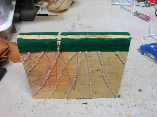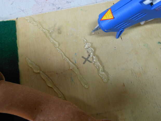 Mirando fotos del libro utilizado en las películas, me pareció que había una especie de costillas o estrías debajo de la "piel" del libro estuvo limitada, así que antes de colocar la mascarilla, disparó la pistola de pegamento caliente.