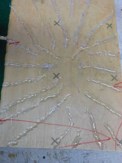 A partir del centro de donde sería la cara, empecé a dibujar líneas radiales espesor en pegamento caliente. Estas en la parte posterior del libro, así continué.