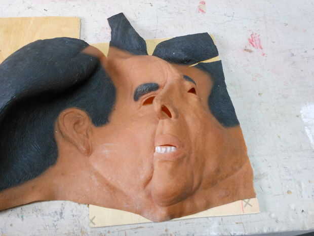 Preparé la máscara primero por cortar alrededor del lado derecho (desde mi punto de vista, que seguirá usando), podas de la oreja y tomando el corte hacia arriba a través de algunos de los cabellos y continuando a la izquierda, pero no cortar la parte de atrás totalmente--sería la contraportada. Para hacer la máscara más plana, cortan rajas desde el exterior de la máscara, avanzando la cara. No corté demasiado, quería asegurarse de que los detalles de la cara me alojé intactos.