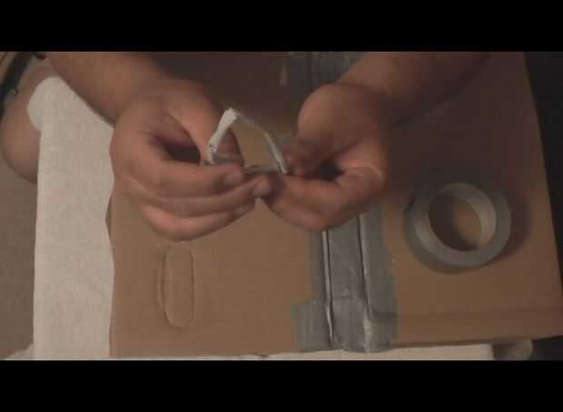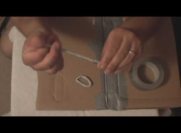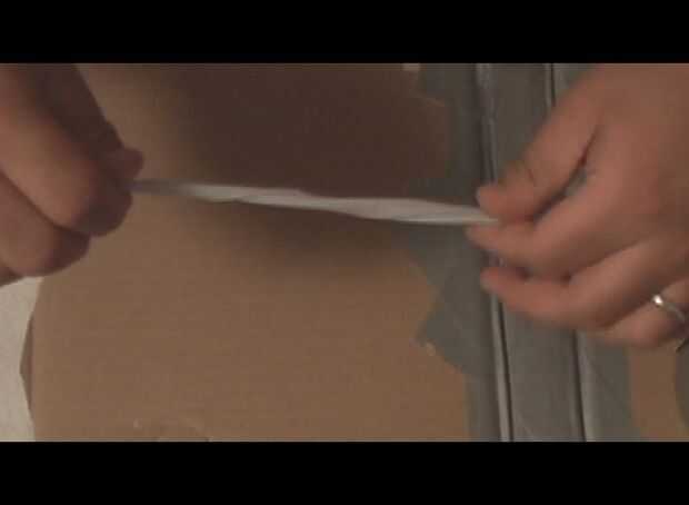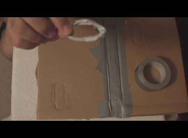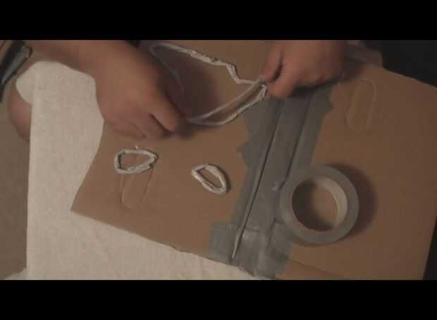 Para los ojos, nariz y la boca me torcí un poco cinta aislante en un rollo largo. Luego hizo las formas deseadas, colocar sobre la cartulina. Usé varios pedazos en la boca para hacerla un poco más gruesa.