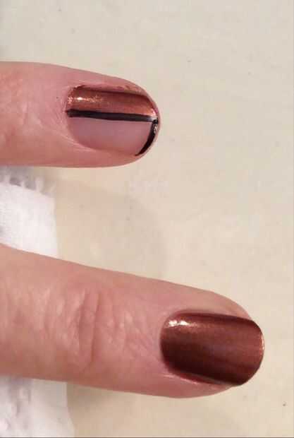 Para el dedo anular, simplemente utilizar el esmalte negro para hacer una raya en el centro de la uña, cubriendo la línea de los polacos anteriores y una frontera a lo largo de la punta de la uña. Para el dedo indicador, le puse un borde alrededor de todo el perímetro de la uña. Esto puede ser difícil de aplicar cuando llegue por la cutícula, por lo que sugiero usar un palillo sumergido en el esmalte negro para cubrir las áreas que son más difíciles de alcanzar. (Consulte los cuadros finales para obtener un ejemplo del dedo indicador)