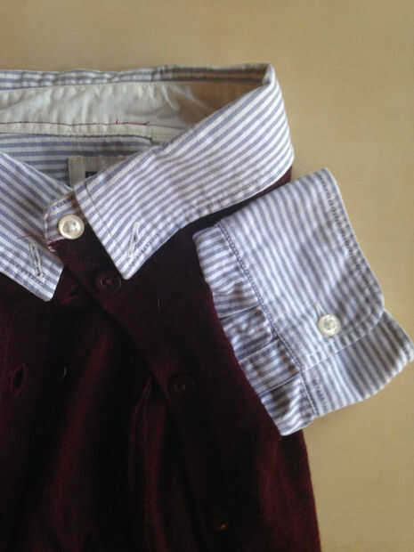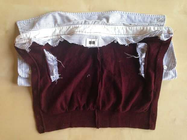 Con el suéter de perro como guía, corte dos ranuras verticales en el suéter nuevo montado en el que insertar las mangas. Preparar las mangas de la camisa me corta de solo 2 pulgadas por debajo de los puños y cubrió a lo largo de los contornos de las ranuras del brazo en el suéter. Puede entonces realizar en a mano o con una puntada recta cuidadosa en su máquina de coser (si están haciendo esto en una máquina que necesite hacerlo en pasos ajustar el prensatelas y gire el manguito).