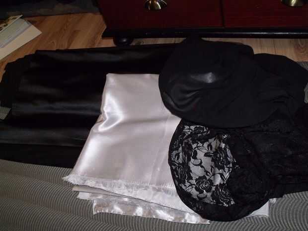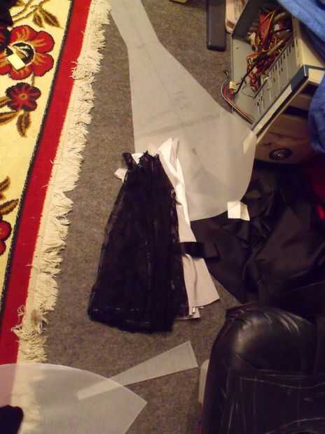 Bueno, usted recortar todo. Por ahora las otras telas. Tres pedazos pequeños de incrustaciones superior y 7 godets. × 2. Tienes que cortar todo el satén y el encaje también. El satén – Si utilizas - es muy resbaladizo y estira todas las direcciones mal, querrá prender o coloque objetos pesados sobre el mismo en todas partes. No demasiado profesionales, pero muy práctico. Dibujo en él es difícil también, un gran gobernante puede ayudar mucho. Ya que no tengo, utilicé el patrón de la falda como una regla...