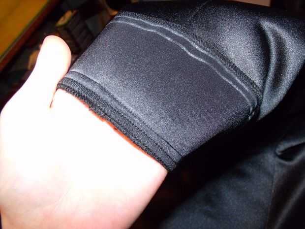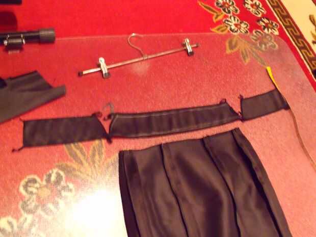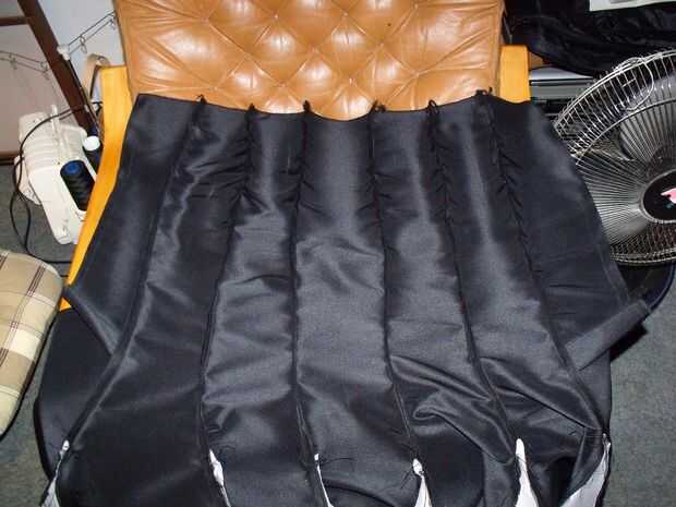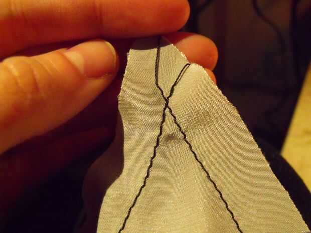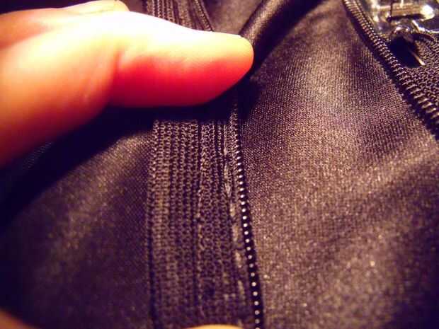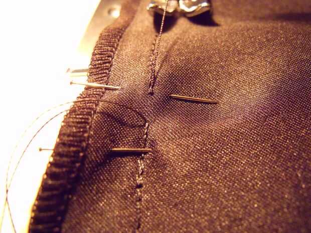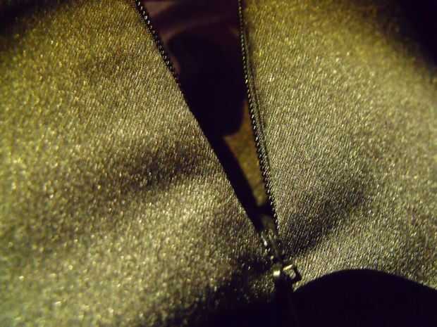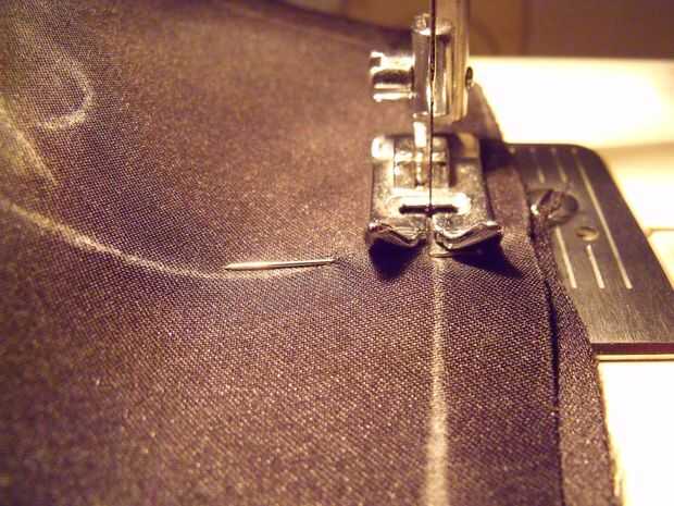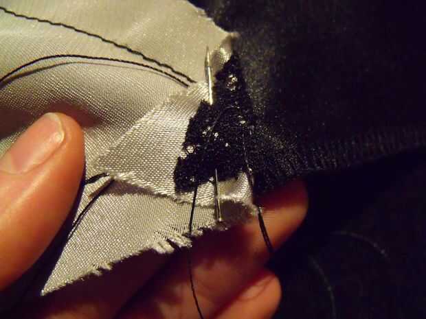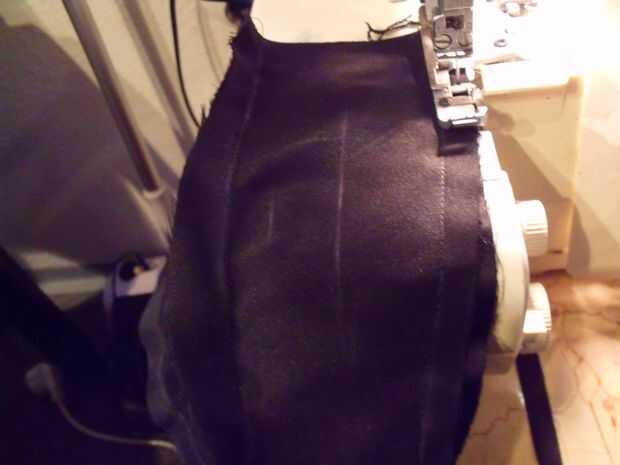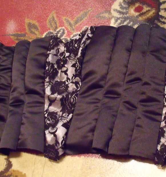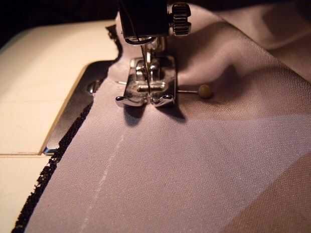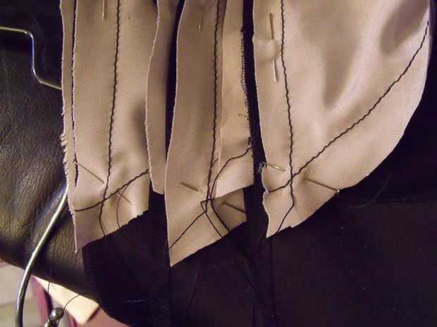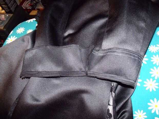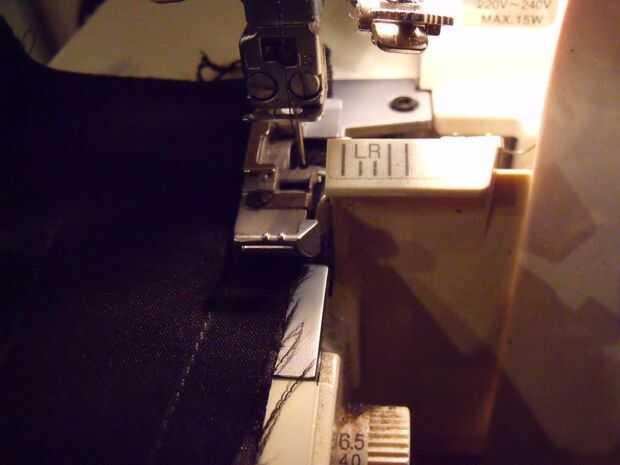 Dejar a un lado y utilizar a su remalladora en algunos de la parte superior. Para los paneles de encaje de raso, utilice el mismo método en cuanto a los godets. Los pines, coserlas, bloquearlos. Las otras partes no tiene que ser bloqueado sin embargo. Prender todo juntos y simplemente coserlas juntas, con un stitchline recto. Para la mejor durabilidad, aquí utilicé un hilo revestido, prácticamente hecho de bolsas y otras cosas más durables, pero esto es opcional. Cuando se cose toda línea vertical – salvo la parte de cremallera – asegurar los bordes entre sí. Cerradura de la parte de cremallera también. Plancha.