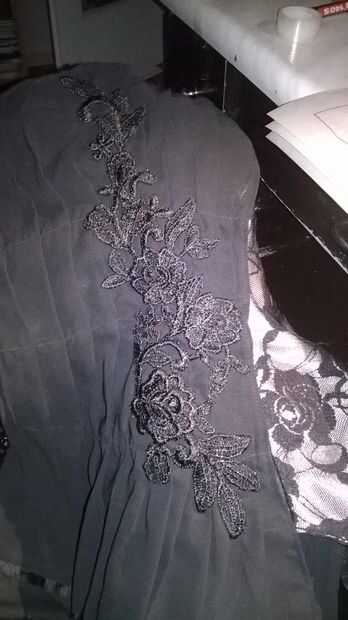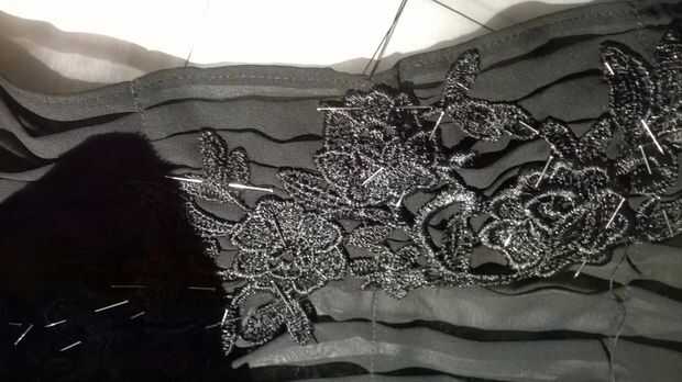 Puede coser el encaje en la falda parte demasiado, mismo método, pero más fácil ya que no es cualquier colmena. Tenga en cuenta, la diferencia en la stretchyness de la tela y los apliques. Para mí, la fueron todo elástico, firme.