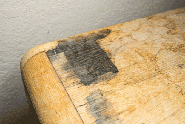 En el borde de mi escritorio seguí una regla de metal oxidado y a veces demasiado regar la planta en el escritorio y el agua piscina por debajo de la regla. En un corto tiempo este conductor con manchas negras a lo largo del borde de la mesa.