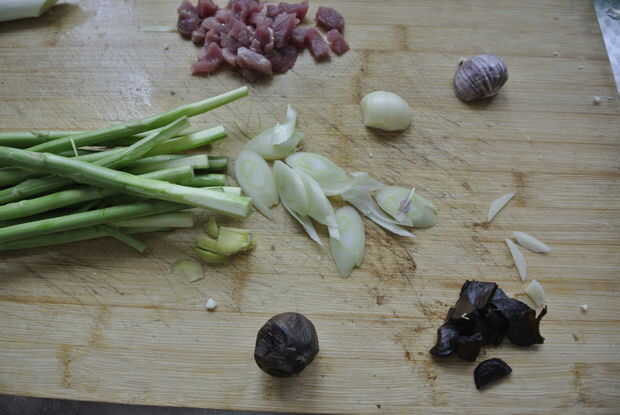 ingredientes:4 x dientes de negro de ajo, en rodajas1/2 cebolla cortada en cubos1/8 libra de cerdo, cortada en cubos125 g o 1 x Pack de champiñones rebanadosAceite de olivaSal y pimientaMétodo:Preparar todos los ingredientes de ajo negro, rebanar los