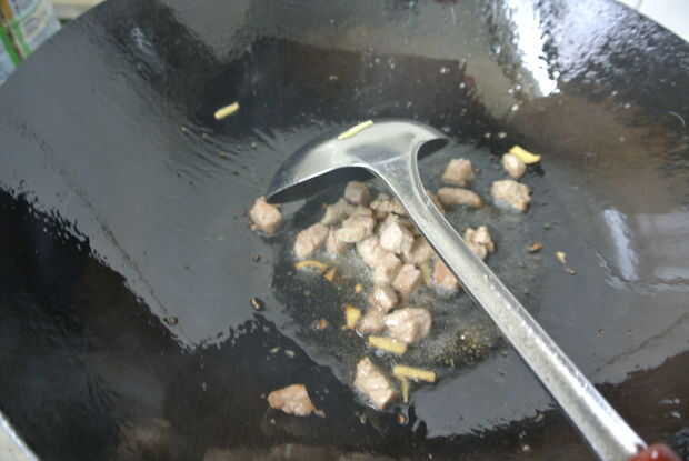 agregue aceite, giger picado y salteado de cerdo en cubos de 10 segundos.