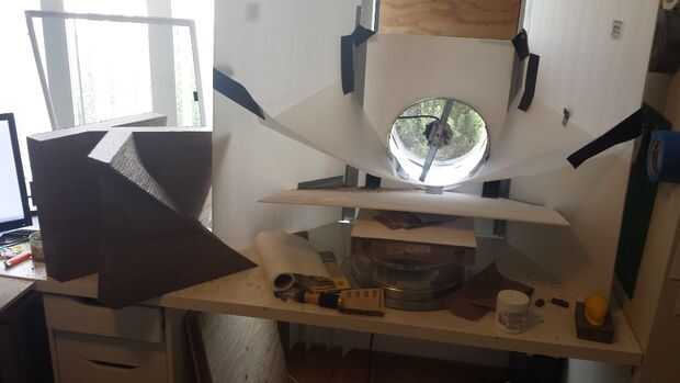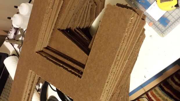 Cada forma de corte CNC vino de la máquina que requiere lijado y limpieza y este paso toman aproximadamente una a dos semanas para completar. Utilicé papel de lija para suavizar los bordes y las superficies de cada letra y algunas de las formas también requirieron el uso de pasta de madera para rellenar huecos y agujeros que fueron creados durante el proceso de corte. Esta es una fotografía de una estación de lija que configurar en mi apartamento con un ventilador para quitar el polvo y suciedad.
