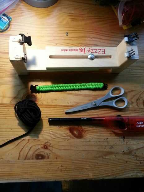 Necesita unos 15 pies de paracord, la pulsera de cola de pescado (que usa 10-12 pies de paracord), tijeras (opcional), plantilla para cortar el cordón, un encendedor (opcional)