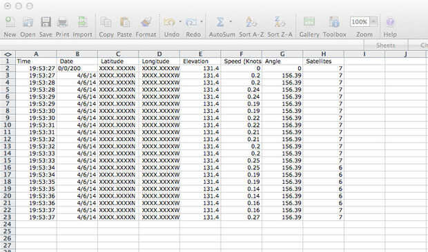 Tiempo, fecha, latitud, longitud, elevación, velocidad (nudos), ángulo, satélites